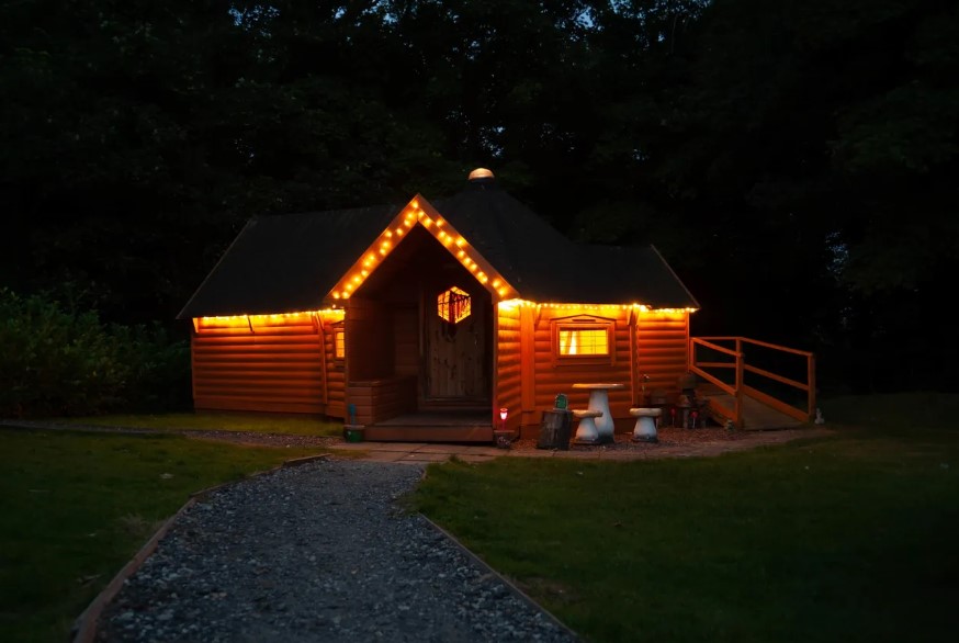kits coty glamping camping cabin with fairy lights and toadstools out front