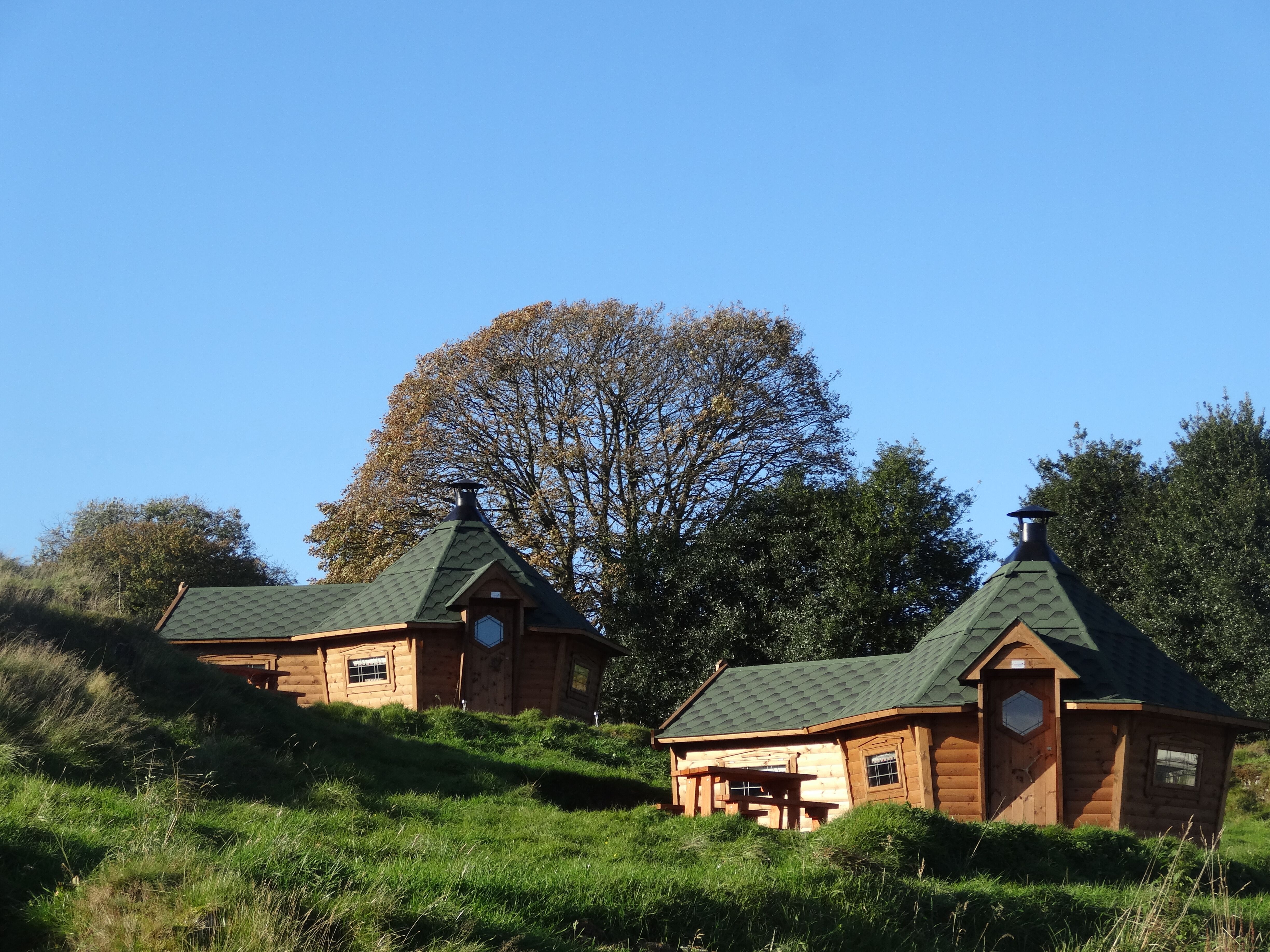 black beck farm camping cabins timber buildings on hillside with green roof and blue skies and tree in background