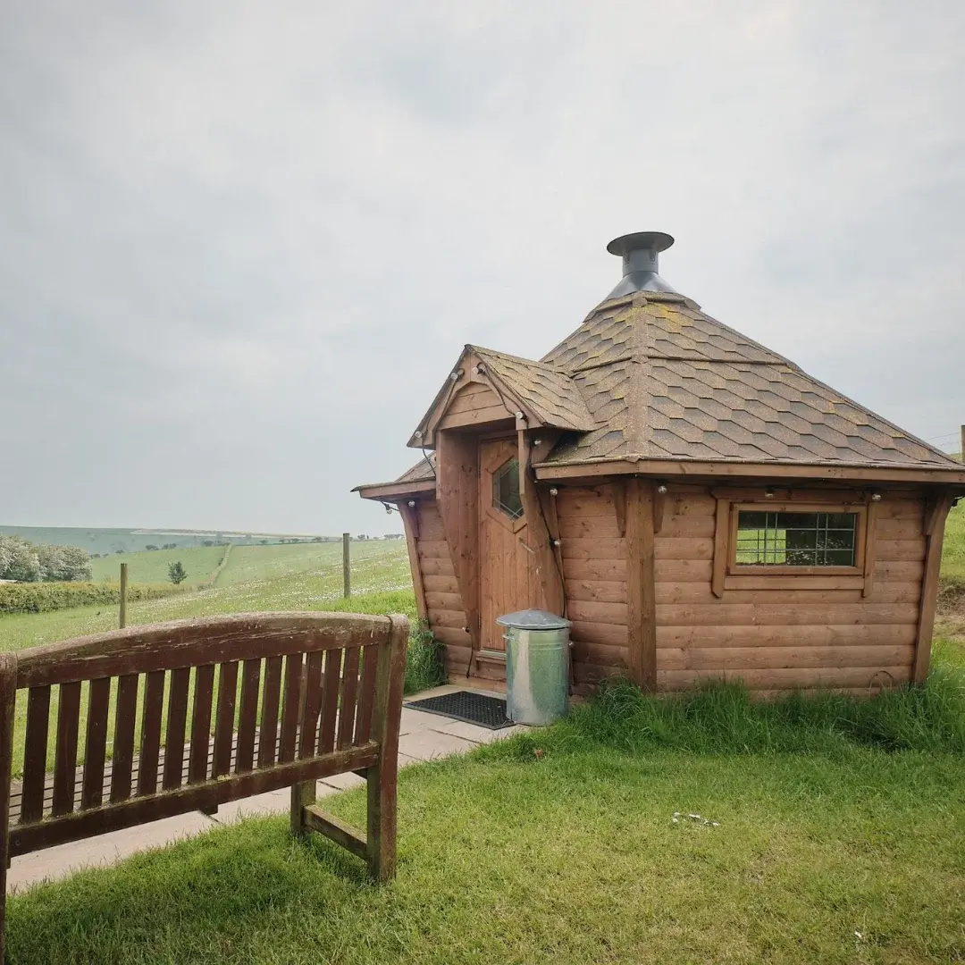 Camping Cabins Humble Bee Farm Smoke Shack BBQ Log Cabin with bench